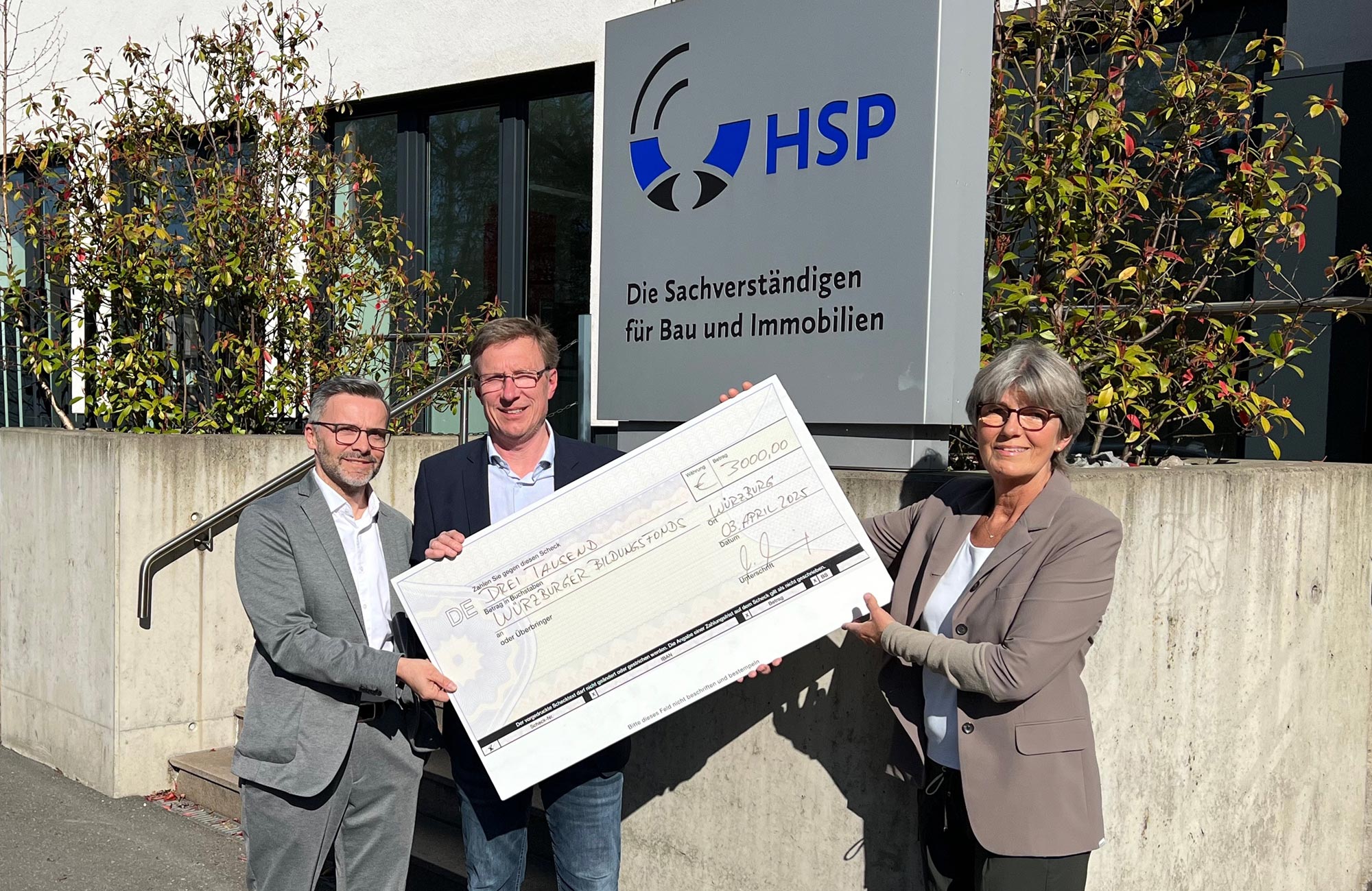 Christian Weis und Markus Stürzenberger, Geschäftsführer der HSP Sachverständige, betonten bei der Scheckübergabe die Bedeutung der Unterstützung für die Bildungschancen der jungen Generation: “Wir sind stolz darauf, mit unserer diesjährigen Spende an den Bildungsfonds der Bürgerstiftung Würzburg und Umgebung Teil einer Gemeinschaft zu sein, die sich für die Zukunft unserer jungen Generation einsetzt.”